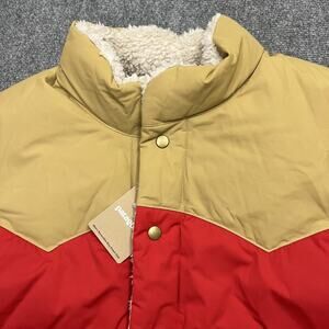 Reversible design: one side is red and tan quilted down, the other is high-pile natural sherpa fleece with tan chest pocket