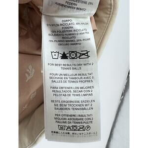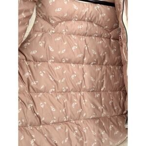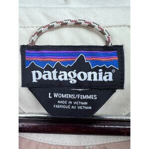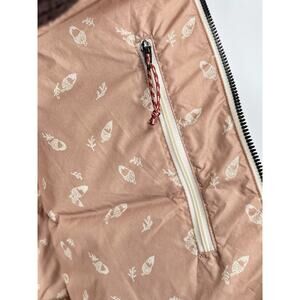 The Patagonia Bivy Hooded Vest is a stylish and practical outer garment designed for women in size Large. Made with warm duck down insulation and a water-resistant nylon outer shell, this vest is perfect for outdoor activities in winter, fall, and spring. The cream and pink color combination adds a feminine touch to the quilted design, while features like a full zip, hood, and pockets provide functionality for travel and casual occasions. The inside lining bears an acorn pattern on a pink/salmon colored background. Crafted with sustainable materials and durable construction, this Patagonia vest is a reliable choice for staying cozy and fashionable in cold weather scenarios.