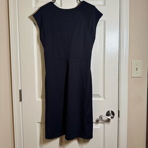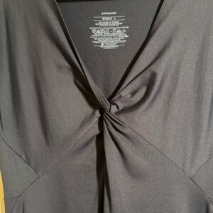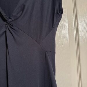 Elegant black midi dress. Features a twisted front design. Cap sleeves for a chic look.