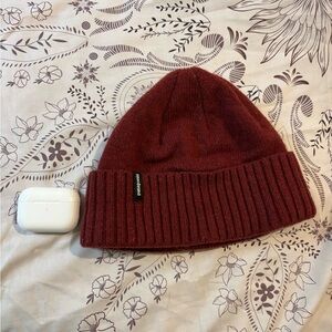 Wool Sequoia red knit hat by Patagonia. Fits snug but flaps cover ears completely when unfolded.