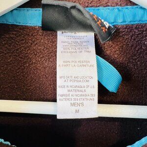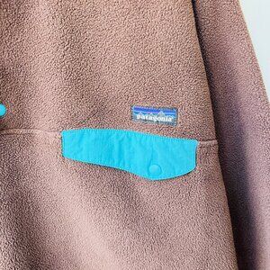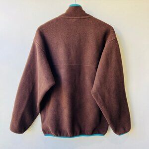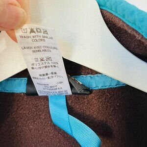 Cozy fleece pullover. Features a brown body with teal accents. Ideal for outdoor adventures.