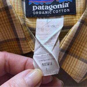 Patagonia Button Down Long Sleeve Organic Cotton Shirt Size Large. Excellent used condition. Yellow and brown plaid design. 2 front button pockets. Measures chest 51", length 31", sleeve 26".