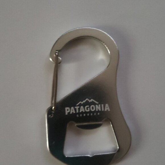 Patagonia Cerveza Carabiners bottle opener keychain. This new carabiner is silver in color. It is approximately 2.75" in size.