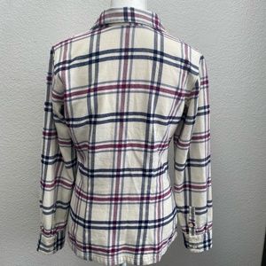 Stylish button-down shirt by Patagonia. Features a cream base with blue and red plaid pattern. Perfect for casual wear.