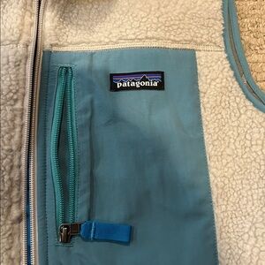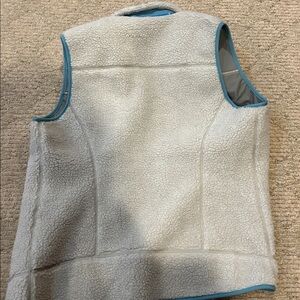 Soft cream fleece vest with blue trim. Includes zippered chest and side pockets.