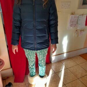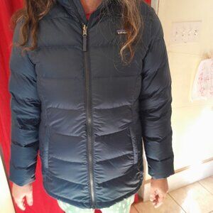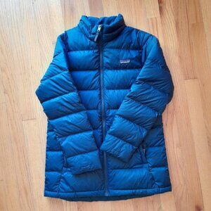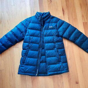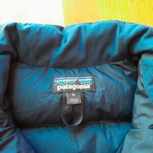 Patagonia Down Sweater XL Boys. Dark Blue, Blue is more the dark color shown that the bright, photos were taken in different light. There is one small pin hole in the back as shown in pictures, otherwise this is in perfect condition. There are two pictures of the hole, one with regular lens, the next with micro lens. XL Kids fits a Woman size s-m as shown in pictures as well.