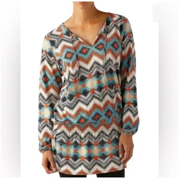 Keywords: Casual, Outdoor, Nature, Sustainable, Hiking, Camping, Long Sleeve, Stretch, Tie Neck, Aztec, Southwestern