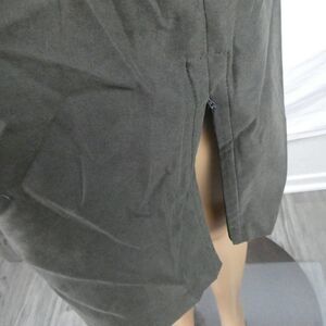 Machine washable polyester, very silky soft material. It has an underbust zip pocket, zip side slits, and zips up the back. The dress is somewhere between grey, brown, and green to my eyes. Really pretty piece! No size.