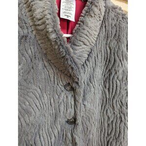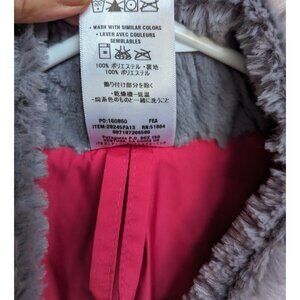 Patagonia Pelage Plush Embossed Fleece Faux Fur in Silver/Grey color. Bold pink lining with spare button sewn in. Two button front closure and slit pockets.