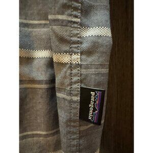 Tags-Patagonia shirt, organic cotton shirt, striped casual shirt, gray and white shirt, XL men's shirt, sustainable fashion, breathable shirt, short sleeve shirt, classic collar shirt, men's button-up shirt, professional casual wear, organic cotton clothing, eco-friendly men's wear