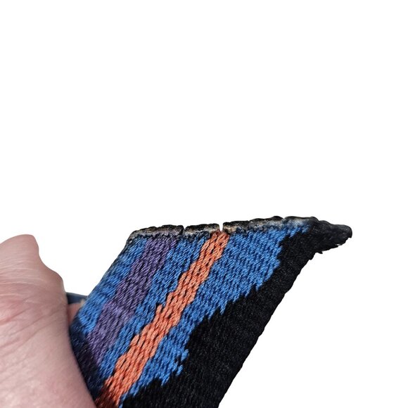 This belt, crafted by Patagonia, blends vibrant blue and orange woven webbing with durability. Modified to fit an 8-10-year-old child, it offers adjustability via its sturdy buckle. Ideal for outdoor adventures or daily wear, it retains the brand's commitment to quality and visually appealing design.