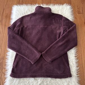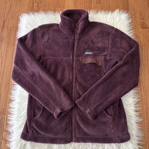 Patagonia Re-Tool fleece jacket in the color purple. Womens size medium. Has pockets. Full zip. Logo embroidered on chest. See pics for measurements. From a smoke free/pet free home