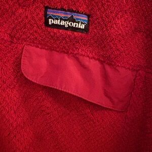 Warm fleece pullover by Patagonia. Features a soft texture and front pockets lined with mesh. Very good condition. Shows up bright red in the pics, but is more of a deep cranberry red.