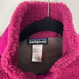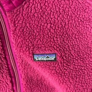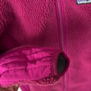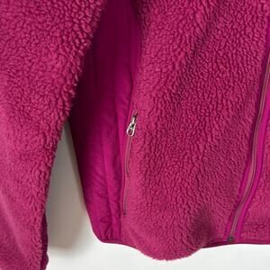 Gently Used Patagonia Full Zip Sherpa Fleece Jacket. This is a women’s large. Lovely shade of red / pink throughout. Thicker and warm. Front pockets. Patagonia patch logo on the chest. Side and sleeve accents. Cute!