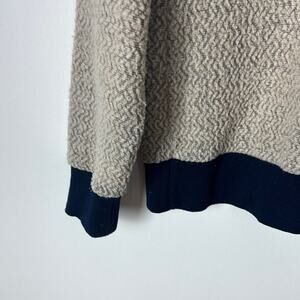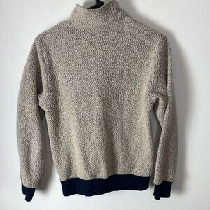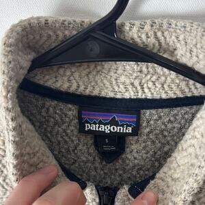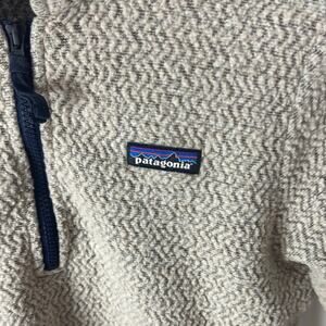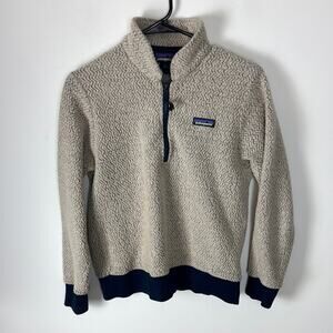 Gently Used Patagonia Quarter Zip Pullover Fleece. This is a women’s small. Mostly a light tan / oatmeal color with navy blue accents on the sleeves and waist. Herringbone pattern throughout. Patagonia patch logo on the chest. 46% polyester, 46% recycled wall, 8% other fibers.
