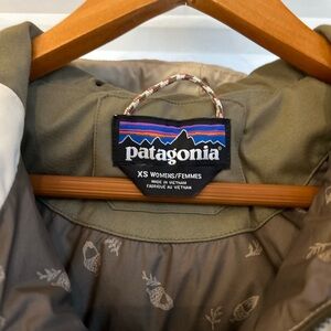 Patagonia jacket in forest green. Features patterned lining. Ideal for outdoor wear.