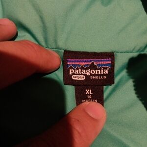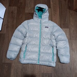 Stay warm and stylish with this Patagonia puffer jacket, featuring a sleek gray and green design. The jacket's insulated construction and attached hood ensure comfort in chilly weather, while its modern quilted pattern adds a touch of sophistication.
