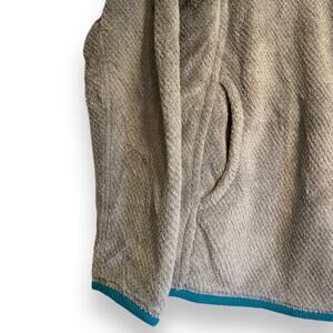 Description: Iconic outdoor wear at its best with this 1/4 snap pullover polyester fleece by Patagonia. The gray fleece features teal accents, a hidden breast pocket, spacious kangaroo style front pocket and plastic teal snaps. Great for camping, hiking, outdoor exercise and running errands,