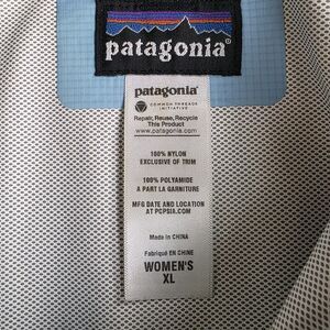 The Patagonia H2NO Jacket in women's XL blue is a stylish and functional outerwear piece perfect for casual occasions. Made from durable nylon material with a softshell fabric type, this windbreaker features a zip closure, logo accents, and a lined interior for added comfort. Ideal for winter, fall, and spring seasons, this mid-length jacket with long sleeves is machine washable and easy to care for. The Patagonia brand ensures quality and reliability, making it a standout choice for outdoor activities or everyday wear.