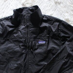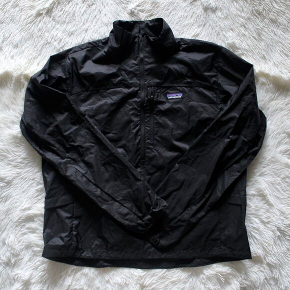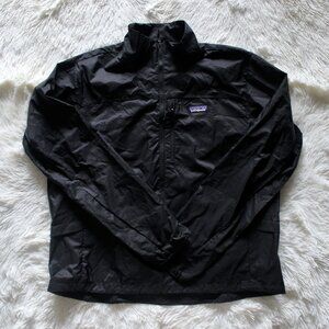 Black Patagonia Half Zip Pullover in a women's size Large. It is new with the tags still attached. It has pockets on the sides that are somewhat hidden. The jacket is very sheer and lightweight, its main intention is to be used in any weather. MSRP $139, purchased from Dicks Sporting Goods.