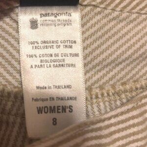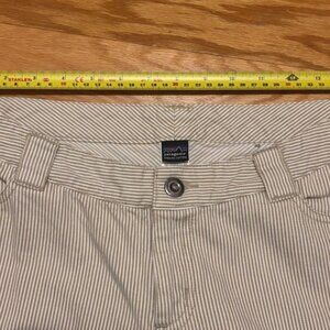 These Patagonia Inga shorts are designed for women in size 8 with a white and tan striped pattern. They feature a slim fit, low rise waist of 30 inches, and a 10-inch inseam. Made of cotton canvas, they have a flat front and a logo accent. Perfect for outdoor activities, these Bermuda style shorts have a slimming effect and are from Thailand. 7.5" Rise. Excellent Condition.