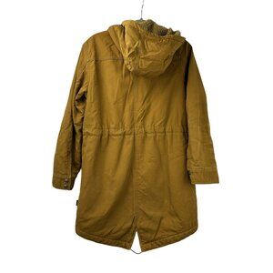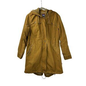 The Patagonia Women's Size Medium Insulated Prairie Dawn Parka Coat Jacket 28291 is a stylish and practical outerwear option for women. Made from organic cotton canvas with a polyester lining, this long parka coat features a solid brown color and is perfect for casual occasions. It includes a hood, full zip closure, and insulation for added warmth, making it ideal for outdoor activities. With its high-quality construction and reputable brand, this jacket offers both comfort and durability for all your outdoor adventures.
