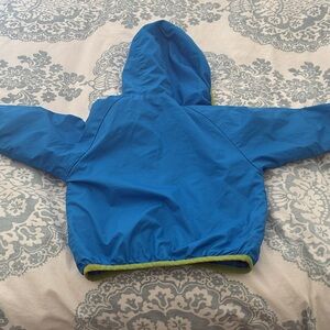 Vibrant blue jacket featuring green accents. Hooded with a front zipper. Jacket in excellent used condition. Does not have any tags but I’m guessing it’s about a 4T.