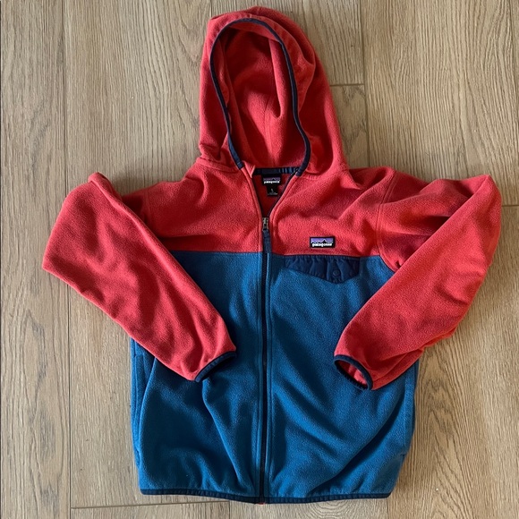 Keep your child warm and stylish with this vibrant red and blue hooded jacket from Patagonia. Perfect for outdoor adventures. Size large