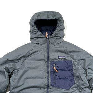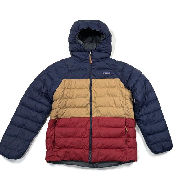 Patagonia kids' down sweater hoody size XL 14. The size tag has been removed, but the measurements are for an XL. Please check measurements for best fit. The inside of the jacket has stains (gray side). Please see pictures for details. Thanks! I ship fast and package securely for safe delivery!