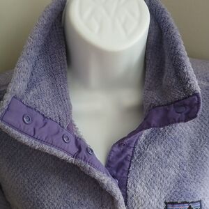 The Women's Patagonia Polartec Re-Tool Snap-T® Pullover is a stylish and versatile piece perfect for casual occasions. Made with polyester outer shell material and lined with Polartec, this jacket features a solid purple color with a snap closure. The pullover style and lightweight design make it comfortable and easy to wear, while the collared neckline and pockets add practicality to the classic outdoor-themed design. Perfect for women in size S looking for a colorful and breathable addition to their wardrobe.