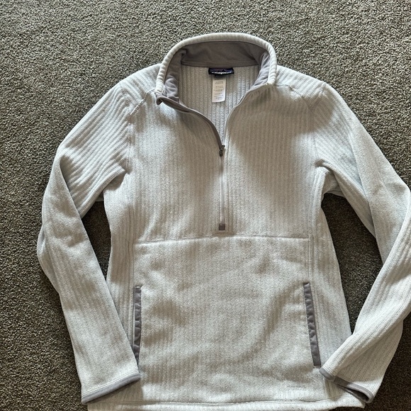 Light gray pullover by Patagonia. Features ribbed texture and quarter-zip design. Includes front pocket.