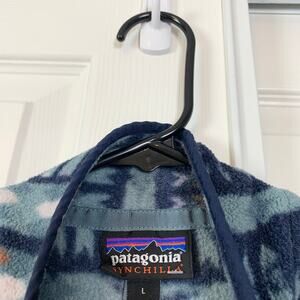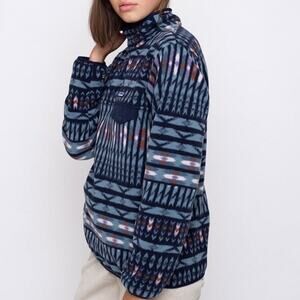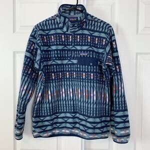 Patagonia Lightweight Synchilla Snap-T Pullover Fleece Shirt Top Jacket in Kuta Klash Printed Shadow Blue. Made of warm, midweight polyester fleece (solids: 85% recycled; heathers: 80% recycled). Nylon trim on stand-up collar reinforces classic Snap-T® 4-snap placket. Yoke seam detail with nylon chest-pocket flap and snap closure. Spandex binding at sleeve opening and hem. Hip length. Great used condition.