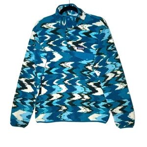 Patagonia Lightweight Synchilla® Snap-T® Pullover in Mountain Print, Blues, White & Black, Size Small. Hip length. Midweight pullover made of Synchilla recycled polyester fleece.