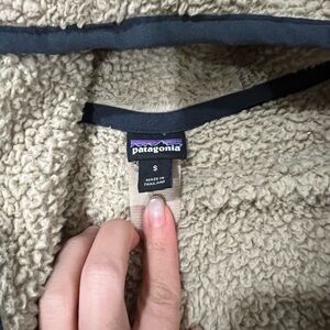 Warm fleece jacket with a soft texture. Features a stylish Patagonia logo. Barely worn, the condition is super new