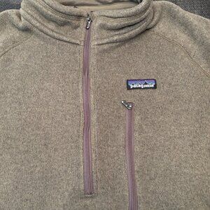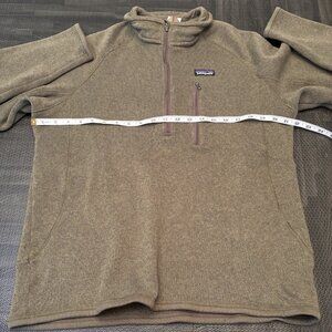 The Patagonia Men's Better Sweater 1/4 Zip Fleece Jacket in Green, Size Large. Made of polyester fleece, this jacket features a 1/4 zip closure, stand-up collar, and a mid-length fit. The jacket is breathable and suitable for winter, fall, and spring seasons.