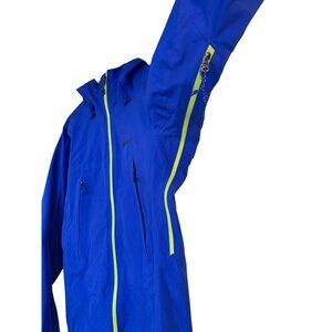 This Patagonia jacket offers lightweight protection, crafted for outdoor adventures. Its waterproof design, adjustable hood, and zippered pockets ensure durability and functionality.