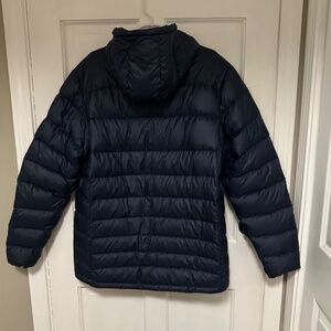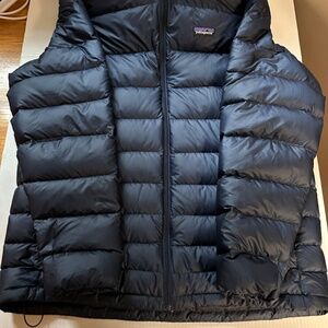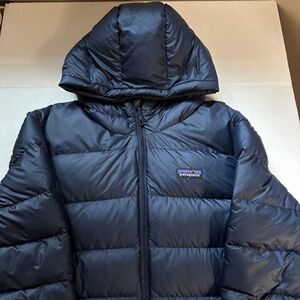 Gently used Patagonia Puffer Hoodie Worn Wear Jacket Men's Size XL. In very nice condition with no rips, tears or smells. All zippers work fine. Blue outside, black inside. Made in Vietnam. Polyester shell and lining, Duck down insulation. A couple spots where the feathers are peeking through. Non-smoking home.