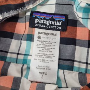 For sale is this Patagonia Men's Large White Green Orange Black Plaid Button Up Cotton Polyester. This shirt is in excellent condition! No holes, stains, or bad smells.