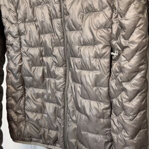 Charcoal quilted jacket by Patagonia. Includes a hood and front zip. Size medium in Excellent Used Condition.