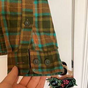 Excellent quality, plaid cotton button down shirt perfect for cooler days ahead. Rich colors of brown, and dazzling blue. Size medium