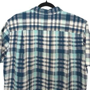 Patagonia Puckerware Short Sleeve in Big Sur Blue size large. Made of an all recycled polyester/organic cotton blend. Textured fabric that lifts shirt away from skin for the warmer weather and dries quickly. Button down with a left chest pocket, side vents and a straight hem. 65% recycled polyester, 35 % organic cotton and in excellent condition. Measurements: length- 28.5 inches and Chest (underarm to underarm)- 23.5 inches
