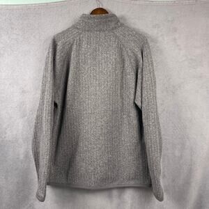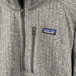 Patagonia Better Sweater pullover fleece in Men's size Large, color is gray, ribbed pattern, quarter zip jacket, sweater knit, stand up collar, kissing-welt zipper garage, zippered left chest pocket