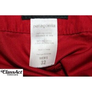 The product is a pair of Patagonia Men's Red Board Shorts with a tie waist and pockets. Made of polyester blended fabric, these board shorts feature a solid red color with a blue character. The 32" waist and 8" inseam make them suitable for a regular fit. Designed for surfing, these machine washable shorts are perfect for the beach and offer both style and functionality. The vintage-inspired beach theme and designer brand make them a fashionable choice for any water activities.