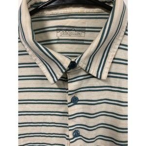 This Patagonia men's polo shirt features a cream and striped design that is sure to complement any outdoor theme. The shirt is made of organic cotton material with a knit fabric type that ensures it's suitable for all seasons. It has a collared neckline and short sleeves, making it a perfect fit for casual or formal occasions.