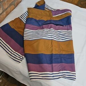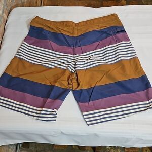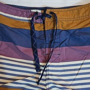 Patagonia Men's Striped Swim trunks, Unlined, ties at waist, one zippered pocket, size 34. Excellent pre loved condition, measurements in pics, smoke free home, ships next day. Bundle and Save!
