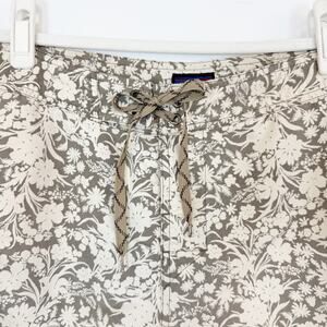 These Patagonia Wavefarer Board shorts are tan with a cream floral print all over, they have a pocket with a zip closure and a button fly with a tie closure. Tags: vacay, vacation, tropical, swimming pool,