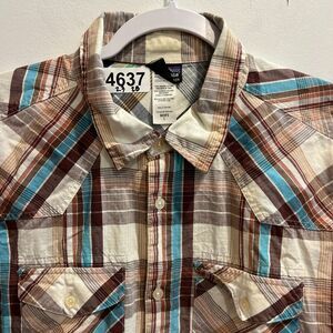 Patagonia Mens White Brown Shirt L Plaid Flannel Button Up Pockets Short Sleeve