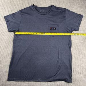 The Patagonia Men's Hydrid Pocket Responsibili-Tee Performance Short Sleeve T-shirt in size XXL (XL) is a high-quality and sustainable clothing option for men who enjoy outdoor activities. This solid blue shirt features a logo accent and a regular fit, making it perfect for casual wear or outdoor adventures. Made by the reputable brand Patagonia, this performance tee combines style and functionality, catering to men who appreciate nature and classic outdoor themes.