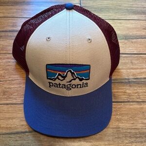 Patagonia Mesh Back Trucker Hat Cap Mountain Logo Patch Blue Maroon Snapback