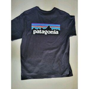 This Patagonia Mountain Logo Responsibili-tee is a blue regular fit T-shirt made of cotton woven fabric. It features a solid pattern and short sleeves with a crew neckline. The shirt is accented with the Patagonia logo and is double-sided. It is perfect for any hiker or outdoorsman who loves the American theme with a colorful and logo design. The shirt is available in size M and is suitable for men of all ages. It is a great addition to any wardrobe and can be worn on any casual occasion.
